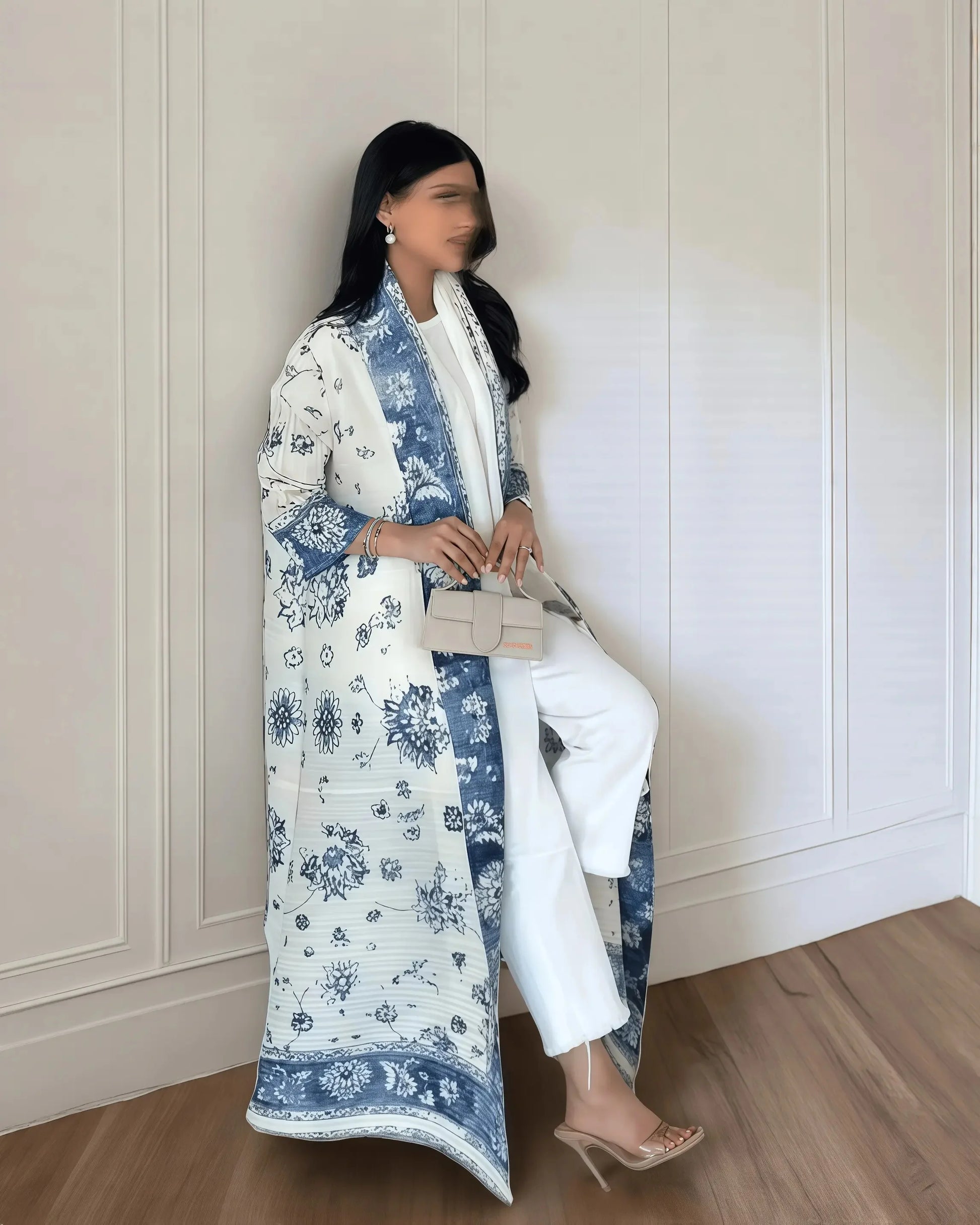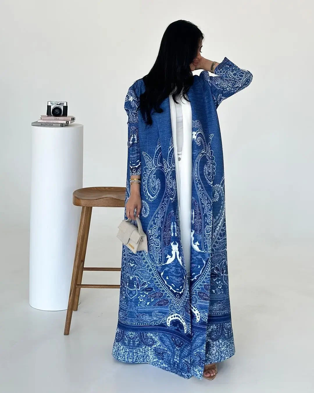 Autumn Women's Long Coat, Retro Printed Long Sleeved Muslim Abaya Saudi Fashion Wrinkled Waist Belt