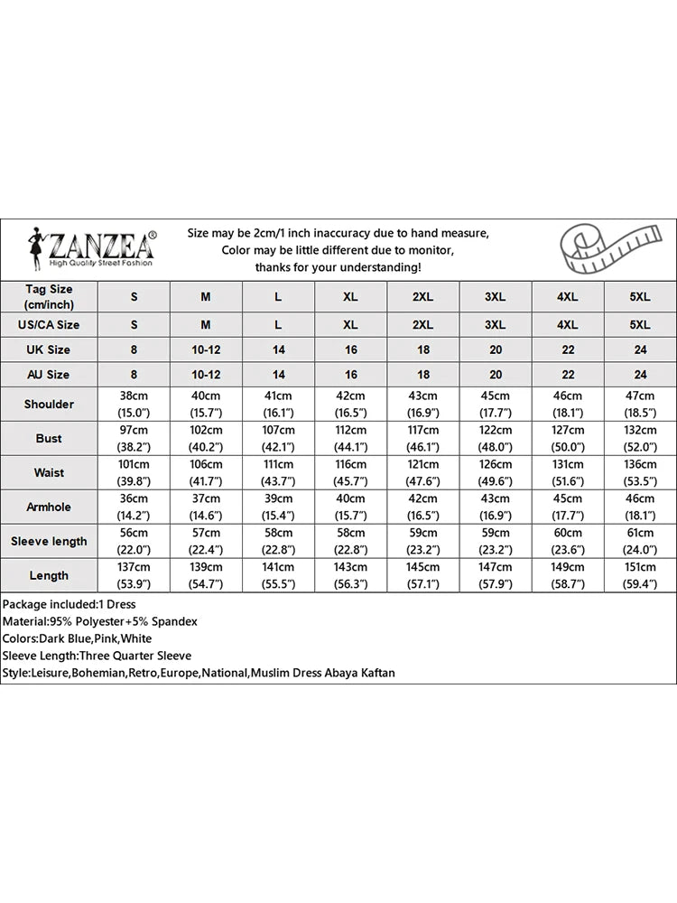 Material:95% Polyester+5% Spandex Colors:Dark Blue,Pink,White Sleeve Length:Three Quarter Sleeve Neckline:O-Neck Pattern:Floral Prints Length:Ankle Length Buckle chain:Button Down Front Thickness:Thin Features:Drawstring sleeves Style:Leisure,Bohemian,Retro,Europe,National,Muslim Dress Abaya Kaftan Season:Spring,Summer,Autumn,Winter Occasion:Family,Party,Beach,Wedding,Holiday,Employment Label: Yes Attentions: 1.The Real Object May Exist Slightly Colors Differences Compared To Images As Different Computers Display.Caution If Minding,Thanks. 2.There Might Be A Manual Measuring 1-3 cm Error.Sorry For Any Inconvenience. 3.Please Prevail On Real Item, Model Images For Reference Only. 4.Attention!!!Please check the size chart carefully before placing the order.